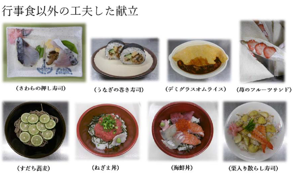 コロナ禍以前のクリスマス会では、バイキング形式で実施しており、嗜好調査で希望の多いお寿司などの海鮮料理、ステーキ、揚げ物、麺類、ケーキ等、様々な料理を提供していました。しかし新型コロナの影響でクリスマス会でのバイキングは中止となった為に、献立をクリスマス仕様に変更しました。手作りのケーキにあわせて洋食にして、サラダにローストビーフを加え通常の献立より豪華に仕上げました。ケーキにはサンタを模した苺を添えてとても好評頂けました。次にクリスマスイヴの昼食にはオリーブ牛ステーキやサーモンのサラダ、夕食には骨付き鶏の献立としました。骨付き鳥は香川の名物料理で塩コショウにニンニクを効かせたスパイシーな味付けが特徴です。クリスマス時期にはお店に行列ができるほど、欠かせない一品です。クリスマスではこれまでのクリスマス会で好評であった料理を、余すことなく提供することで楽しんで頂きました。その他、行事食以外の献立の写真を載せております。香川・徳島県で有名な鰆の押し寿司やすだちそば等です。